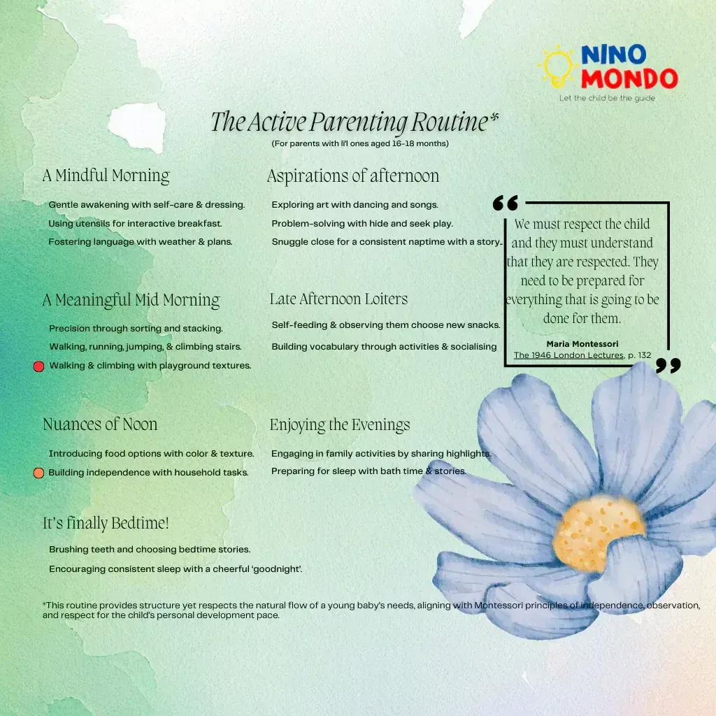 Many parents crave a calming guideline for structuring their dayâbecause unpredictability in the early years often adds to stress. While not everything can be planned, that early madness can be gently methodised with our stage based Montessori-Aligned Peaceful Parenting Routineâa 'pin up on your fridge' guide designed to support your (or any other carer's) daily interactions and activities with your little one with calm, purpose, and connection.