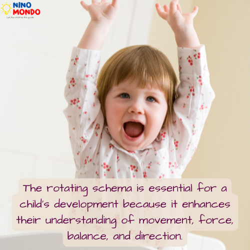 The rotating schema is essential for a child’s development because it enhances their understanding of movement, force, balance, and direction. As they engage with spinning, turning, and twisting, they are also developing fine and gross motor skills, spatial reasoning, and body control.