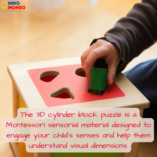 The 3D cylinder block puzzle is a Montessori sensorial material designed to engage the senses of sight and touch and introduce the child to the visual dimensions.